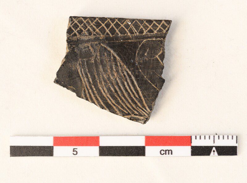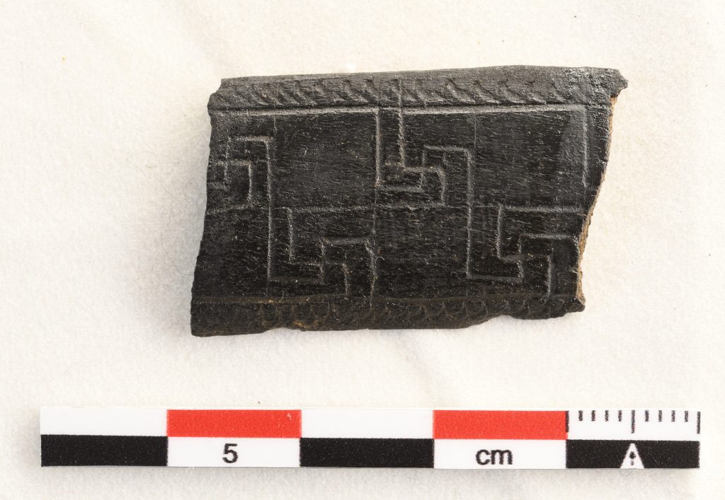 Pieza de hueso plano-convexa con decoración incisa que, seguramente junto a otras piezas similares, forraría un mueble de madera del que se pudieron recuperar algunos fragmentos carbonizados, algunos con las plazas de hueso aún incrustadas. Se trataría de muebles decorados mediante la técnica de la taracea. Decoración incisa en la que se alternan esvásticas y […]