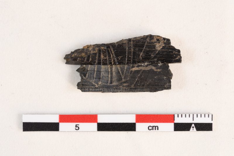 Fragmento de una placa de marfil con decoración incisa. Presenta, además, un encaje, observable desde la vista de la sección, para penetrar en las ranuras de las cantoneras. Presenta una pierna y pie posiblemente humano y rayas indeterminadas.