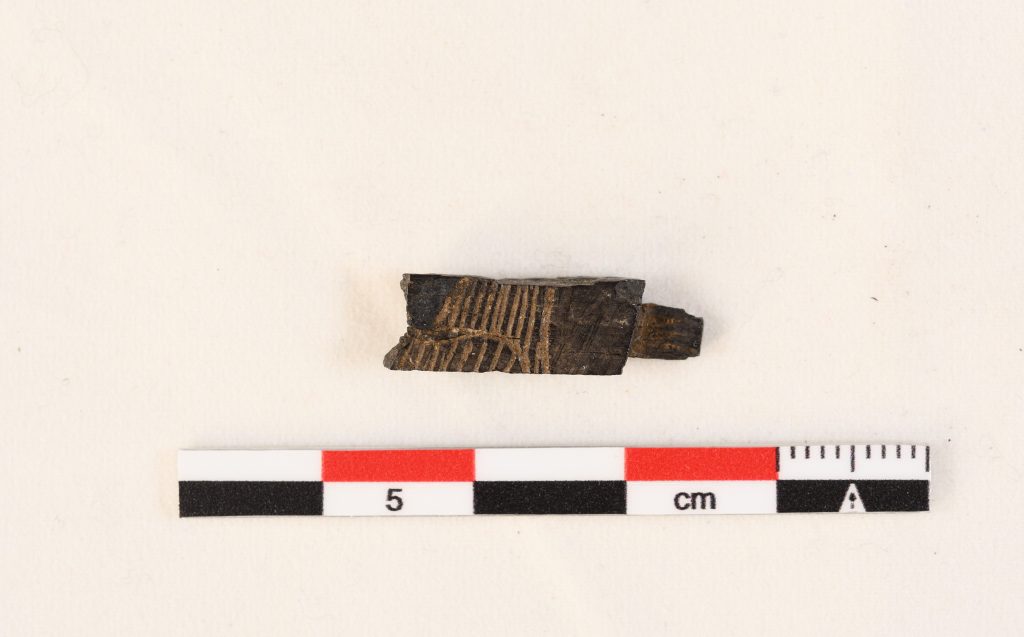 Fragmento de una plaquita de marfil con decoración incisa. La decoración incisa parece corresponder a parte del ala de un animal.